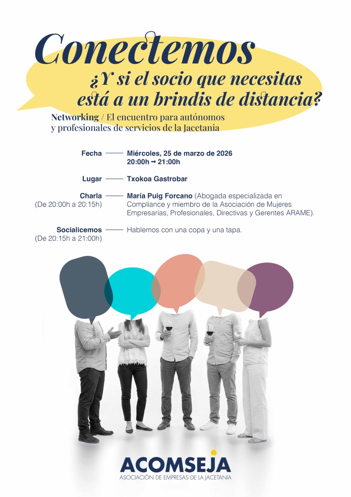 “Conectemos” es el nombre de la nueva iniciativa que va a poner en marcha la Asociación de Empresas de la Jacetania para establecer espacios de encuentro e intercambio entre sus asociados. La primera cita de este formato de networking, que tiene un doble enfoque profesional y social, será el próximo miércoles, 25 de marzo, a las 20 horas en el Txokoa Gastrobar de Jaca con la participación de María Puig Forcano, abogada especializada en Networking y miembro de la Asociación de Mujeres Empresarias, Profesionales Directivas y Gerentes (ARAME).